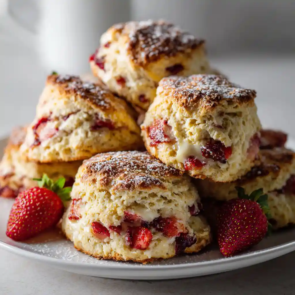 Lemon-Blueberry Strawberry Scones: Replace half the strawberries with fresh blueberries and add 1 tablespoon of lemon zest to the dough. The blueberries add juicy bursts while zest brightens the scone without changing technique.